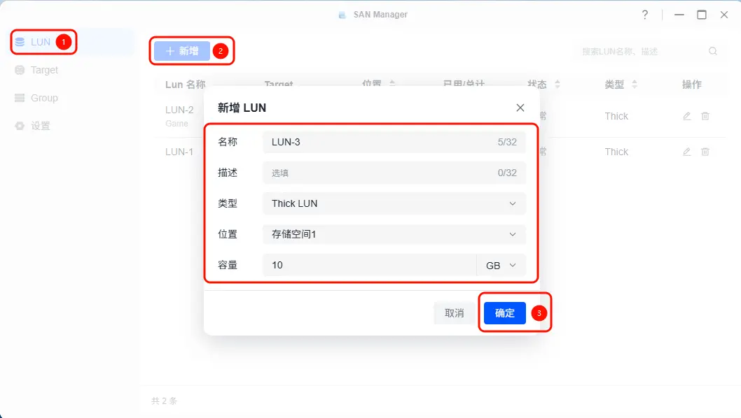 2. 打开 SAN Manager,点击【LUN】>【新增】,启动 LUN 创建向导,创建虚拟磁盘(LUN)。