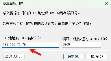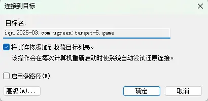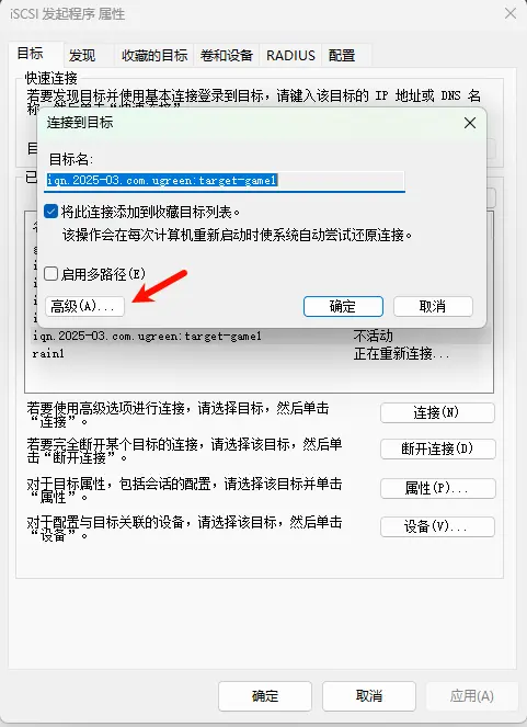 3. 再次连接目标 IQN,点击【高级】,完成以下设置: