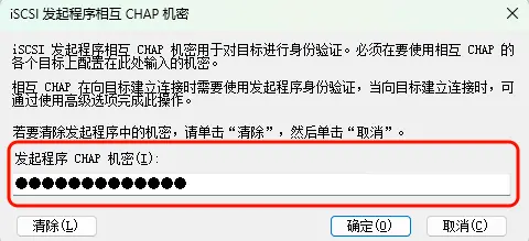 2. 在弹窗中填写 NAS 设置的 相互 CHAP 密码,点击【确定】。