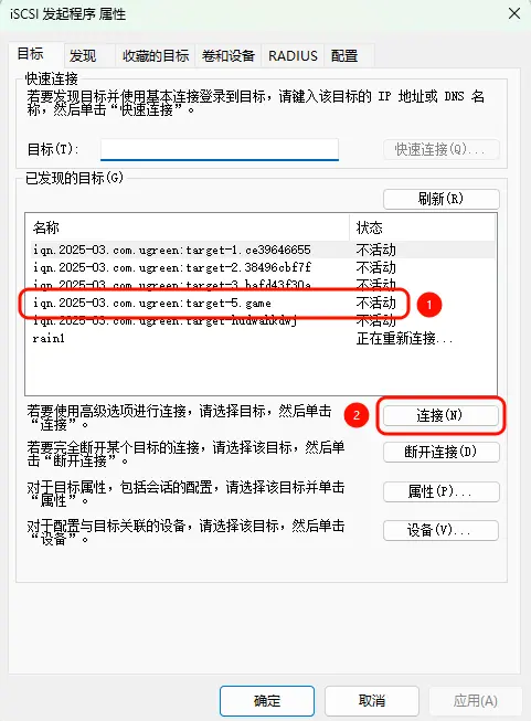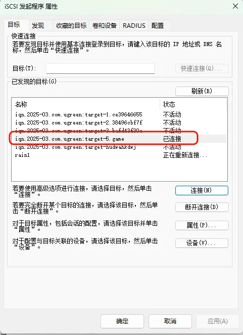 7. 如果目标状态显示为“已连接”,说明 iSCSI 虚拟磁盘连接成功。