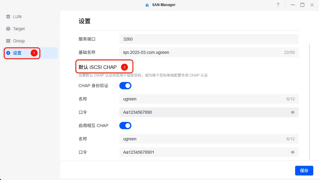 1. 打开 SAN Manager,点击【设置】,在右侧找到 默认 iSCSI CHAP 设置项;
