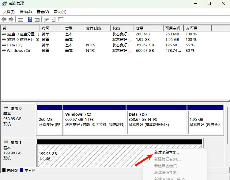 10. 右键点击新磁盘未分配空间,选择【新建简单卷】。