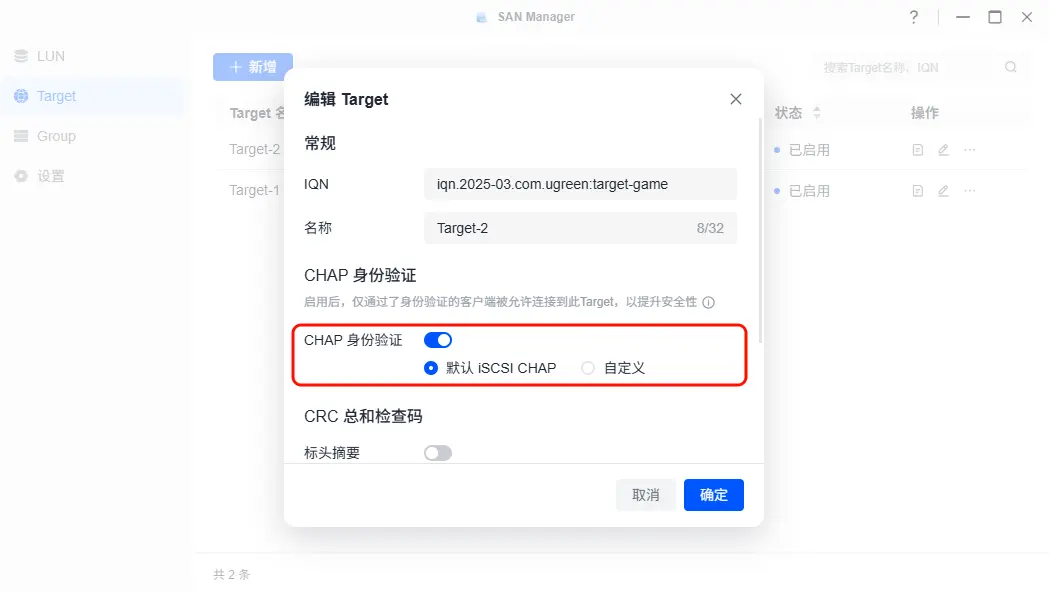 CHAP 是一种用于增强 iSCSI 连接安全性的身份验证机制。它通过用户名和口令在客户端与 NAS 之间进行验证,防止未经授权的设备连接 iSCSI Target。